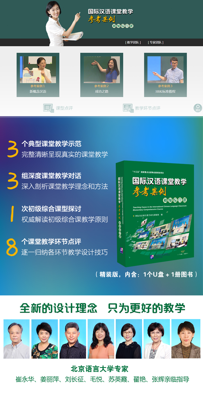 本產(chǎn)品全面展現(xiàn)了教學(xué)理念的先進(jìn)性、教學(xué)方法的多樣性、教學(xué)示范的代表性、教學(xué)研討的延展性、技術(shù)研發(fā)的創(chuàng)新性,是一座百科式的初級(jí)綜合課教學(xué)寶庫(kù)。